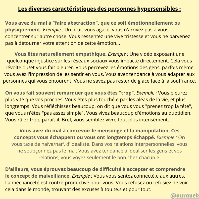 - Les personnes hypersensibles peuvent réagir de manière intense aux émotions des autres, aux interactions sociales, aux bruits forts, aux situations stressantes, etc.