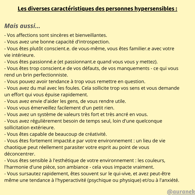 Les personnes hypersensibles peuvent être plus réceptives aux émotions des autres, avoir une profonde empathie, et être créatives, mais elles peuvent aussi être plus vulnérables au stress, à l'anxiété, et à la surstimulation. L'hypersensibilité est parfois associée au trait de personnalité de la "sensibilité élevée" ou à la "sensibilité sensorielle". Il est important de noter que l'hypersensibilité peut varier d'une personne à l'autre et qu'elle peut être influencée par divers facteurs, notamment génétiques et environnementaux.